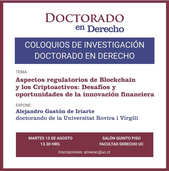 El pasado martes 13 de agosto, tuve el placer de presentar mi ponencia, “Aspectos regulatorios de Blockchain y los Criptoactivos: Desafíos y oportunidades de la innovación financiera”, ante la Escuela de Doctorado en la Facultad de Derecho de la Pontificia Universidad Católica de Chile.
